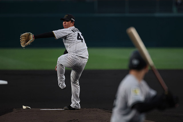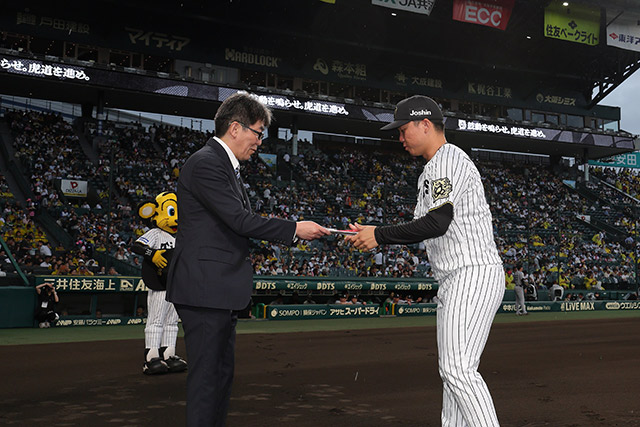 球団選定3・4月度月間最優秀選手に村上頌樹選手が選ばれ、21日(水)、阪神甲子園球場での対読売ジャイアンツ戦の試合前に表彰式を行いました。