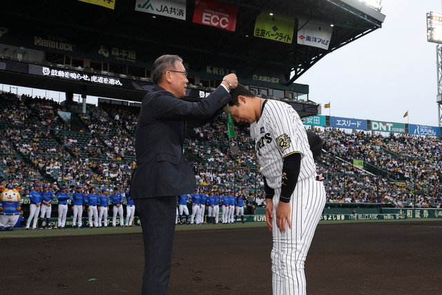 28日(水)、阪神甲子園球場での対横浜DeNAベイスターズ戦の試合前に、4月26日(土)の対読売ジャイアンツ戦で、「公式戦通算1000試合出場」を達成した大山悠輔選手の表彰式が行われました。