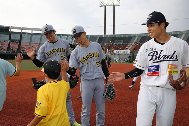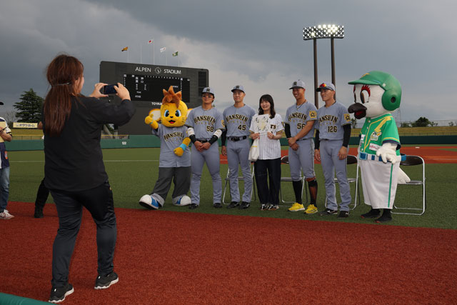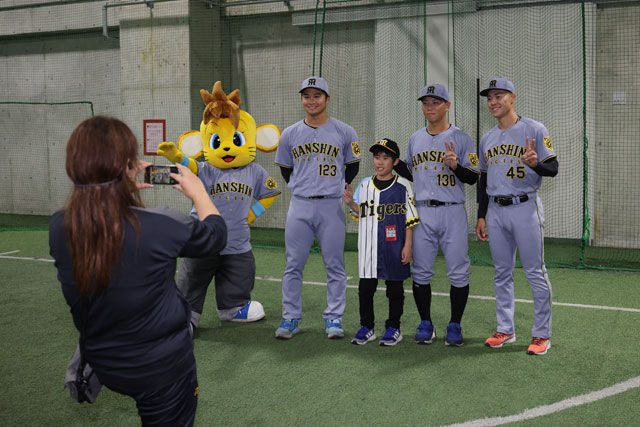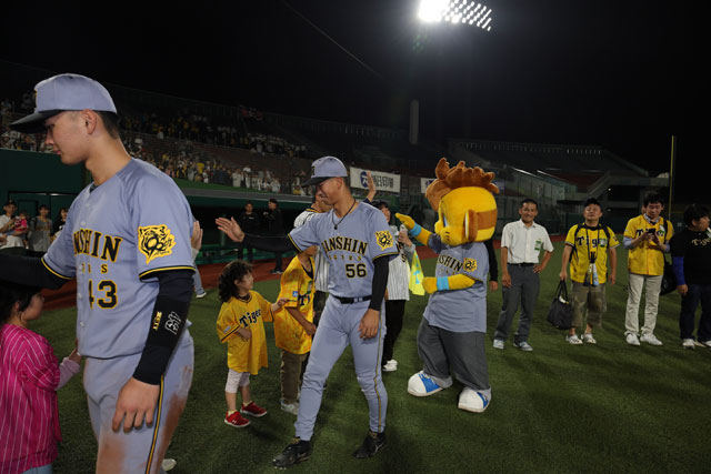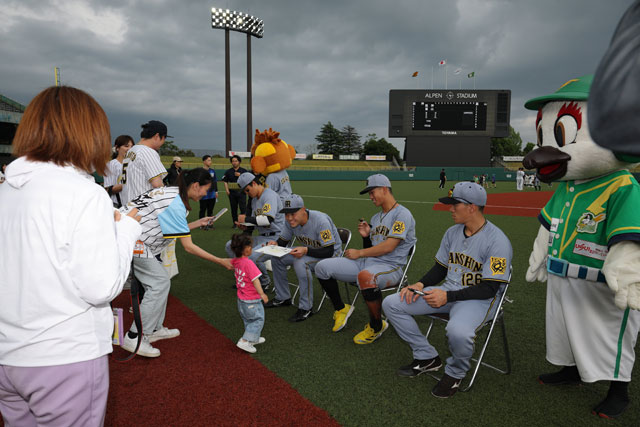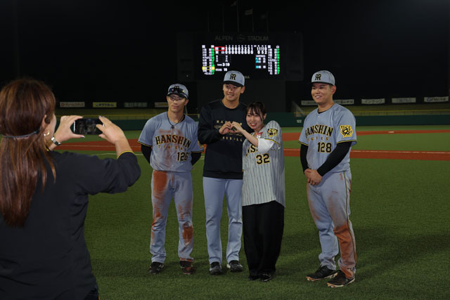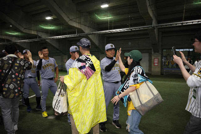 試合前には、グラウンドレベルでの練習見学会、少年少女野球チームとタイガース・富山GRNサンダーバーズの選手によるキャッチボールイベントや、記念撮影会を行い、試合終了後には、恒例となったファン交流イベントを実施。グラウンドに立った約60名のファンの皆さまと、ハイタッチイベントや、ヒーロー選手との記念撮影会を行いました。