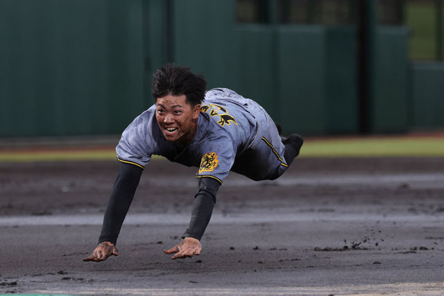 | ヘッドスライディングパフォーマンスを披露する川﨑選手 | スタンドのタイガースファンにサインボールを投げ入れる前川選手 |
