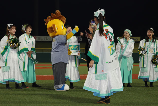 5回裏終了後には、タイガースサイングッズが当たる大抽選会を実施。尼崎から駆けつけたコラッキーが、富山GRNサンダーバーズオフィシャルよさこいチーム「みんと」の皆さんと一緒にイベントを盛り上げました。