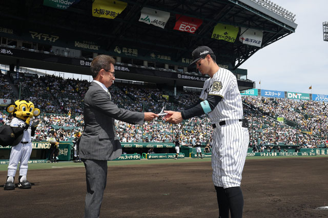 21日(土)、阪神甲子園球場での対福岡ソフトバンクホークス戦の試合前に、6月5日(木)の対北海道日本ハムファイターズ戦で「公式戦通算100本塁打」を達成した佐藤輝明選手の球団表彰が行われました。