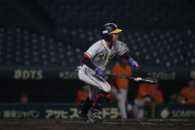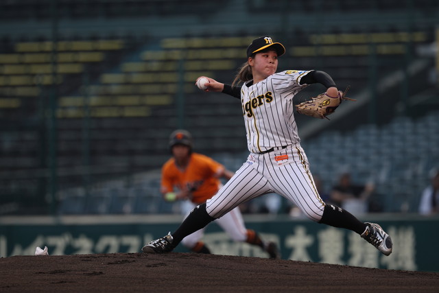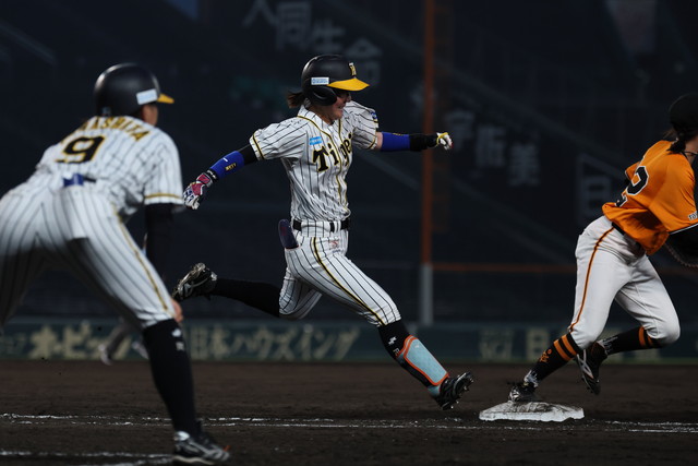 3年目を迎えた交流戦。過去の通算成績は、阪神TWは0勝3敗1分とまだ白星がなく、特に甲子園では過去2試合で得点を奪えていない。メンバーが大きく入れ替わった今シーズンは、新生チームで待望の初勝利を目指す。初回から両チーム、走者を出しながら、先発投手が粘りの投球を見せ、無得点のまま迎えた3回表、読売女子は、1番中村、2番上條の連続右安打で1死1・3塁のチャンスをつくり、3番内田の中適時打で1点を先制する。