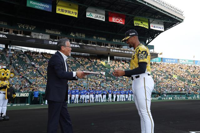 16日(水)、阪神甲子園球場での対中日ドラゴンズ戦の試合前に、「6月度大樹生命月間MVP賞」を受賞したジョン・デュプランティエ選手の表彰式が行われました。