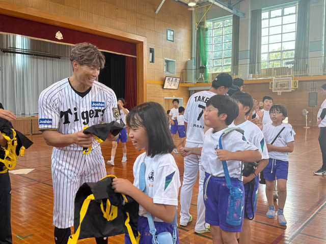 最後はみんなで記念撮影会、ハイタッチ会が行われ、阪神タイガースから生徒の皆さんへゲストティーチャーの記念として、プレゼントを贈呈しました。