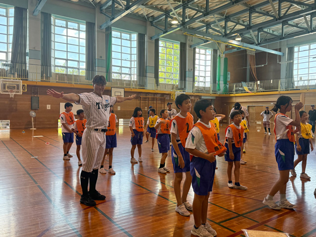 授業では、5年生の皆さんに野球の基本である「打つ」「捕る」「投げる」を体験してもらい、対戦型ミニゲームの実践や、質問コーナーを設けて楽しい時間を過ごしました。