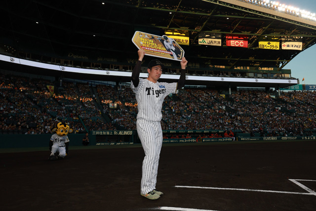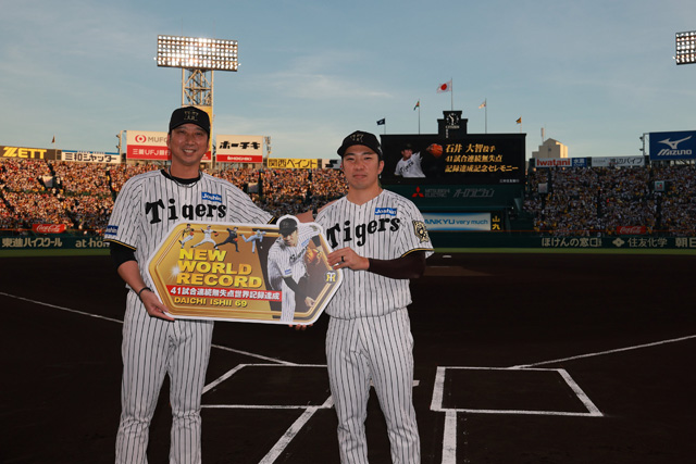 6日(土)、阪神甲子園球場での対広島東洋カープ戦の試合前に、石井大智選手の公式戦通算41試合連続無失点達成を記念し、セレモニーを実施しました。石井大智選手には球団より賞金と記念品が授与されました。
