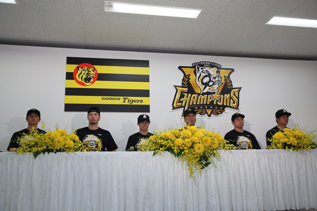 7日(日)、JERA セ・リーグ2025の優勝が決定し、藤川球児監督、中野拓夢選手、石井大智選手、佐藤輝明選手、才木浩人選手、近本光司選手が共同記者会見を行いました。