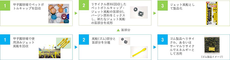 再開にあたっては、昨年の実証実験で使用したものと同様の専用ポンプ式ジェット風船を採用し、周囲の飛沫対策を施します。また、球場内には、専用の回収ボックスを設置し、ファンの皆さまのご協力も得ながら使用済みジェット風船の回収と再資源化に取り組みます。さらに、空気注入部分(笛)は、回収したジェット風船の笛部や、阪神甲子園球場で回収しているペットボトルキャップをリサイクルした再生材等を使用し、環境に配慮したうえで実施します。