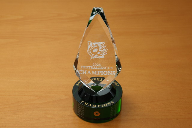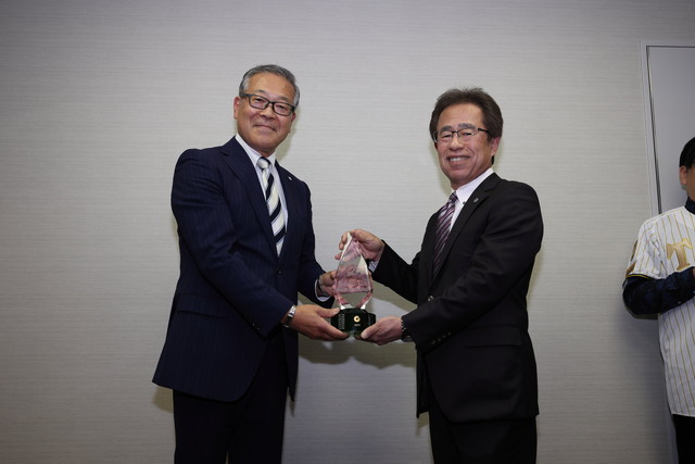 31日(火)、2025年JERAセントラル・リーグ公式戦の優勝トロフィーのレプリカが、セントラル・リーグ杵渕和秀統括から粟井一夫社長へ贈られました。