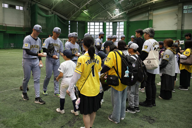 室内練習場では、練習見学会や地元・高知県の少年少女野球チームとタイガース・ファイティングドッグスの選手によるキャッチボールクラシック、ミート&グリート、サインボールプレゼント、そしてハイタッチ会が行われ、雨天にもかかわらずご来場いただいた全国のファンの皆さまとメモリアルな時間を過ごしました。