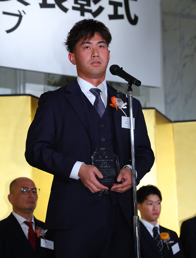 関西運動記者クラブ選定「第68回 関西スポーツ賞」の表彰式が、26日(木)に大阪市内のホテルにて行われ、「特別賞」を受賞した桐敷拓馬選手が参加しました。また、前監督の岡田彰布オーナー付顧問が「功労賞」を受賞されております。
