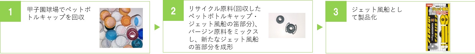 | ジェット風船のリサイクルについて 今回の実証実験で使用するジェット風船の空気注入(笛)部分には、阪神甲子園球場のオフィシャルエコパートナーである帝人フロンティア株式会社の協力を得て開発した、ペットボトルキャップの再生原料(阪神甲子園球場で回収したペットボトルキャップも一部使用)を使用しています。 リサイクルの流れ①(笛部分)