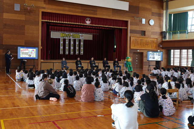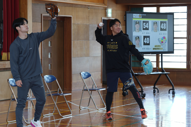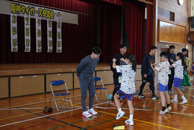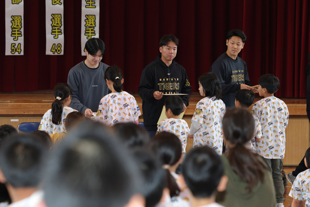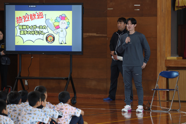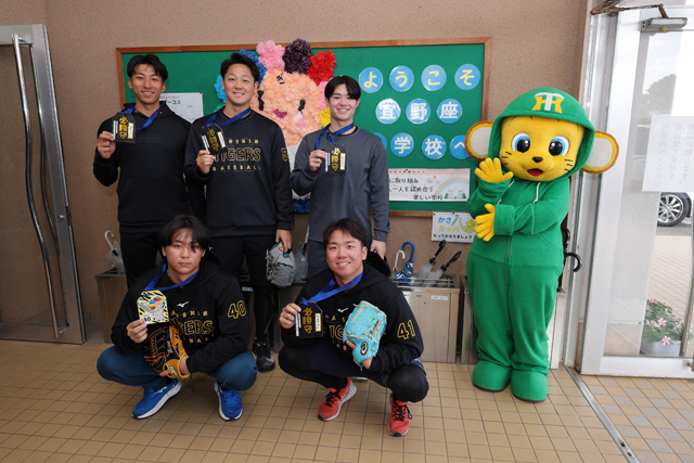 30日(火)、 中野拓夢選手、村上頌樹選手、茨木秀俊選手、井坪陽生選手、木下里都選手とキー太が、春季キャンプ地である沖縄県宜野座村の宜野座村立宜野座小学校を訪問しました。266名の生徒の皆さんが参加された交流会では、質問コーナーやじゃんけん大会などで楽しい時間を過ごしました。