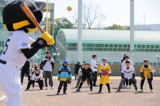 鳴尾浜球場のグラウンドでは、タイガースアカデミーコーチによるノック、ブルペンやマウンドでの投球体験、ベースランニングなど、グラウンドを自由に使った野球体験会を開催。