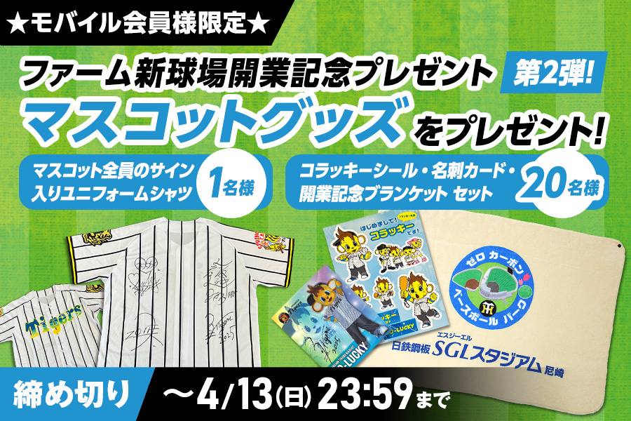 公式モバイルサイトでは「ファーム新球場開業記念」企画プレゼントの第2弾といたしまして、トラッキー・ラッキー・キー太・コラッキー全員のサイン入りユニフォームシャツを抽選で1名様に、コラッキーのシール・名刺カード・「日鉄鋼板 SGLスタジアム 尼崎」開催オープニングゲームで入場者プレゼントとして配布いたしました開業記念ブランケットをセットにして20名様にプレゼントいたします!