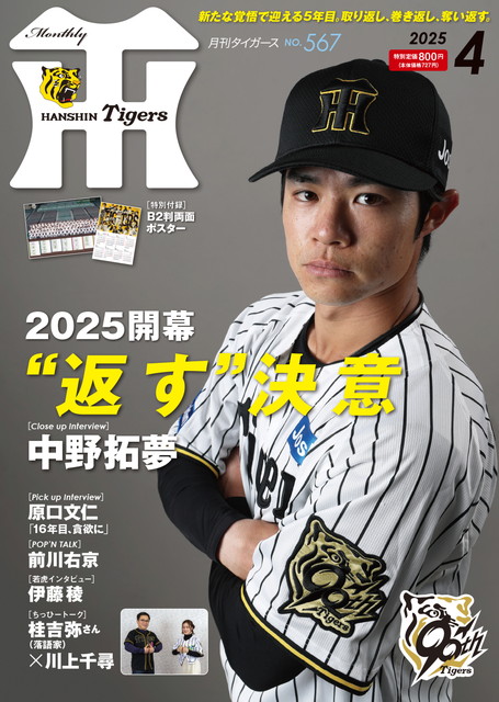 月刊タイガース4月号の表紙と巻頭インタビューには、中野拓夢選手が登場。なかなか思うようにいかなかった昨年からの巻き返し、そしてチームのV奪回に向けて、今年の意気込みをたっぷりと語ってくれました。その他、原口文仁選手、伊藤稜投手のインタビュー、前川右京選手の私服インタビュー、オープン戦の模様など、今月もタイガース情報満載。特別付録「B2判両面ポスター」付きでお届けします。
